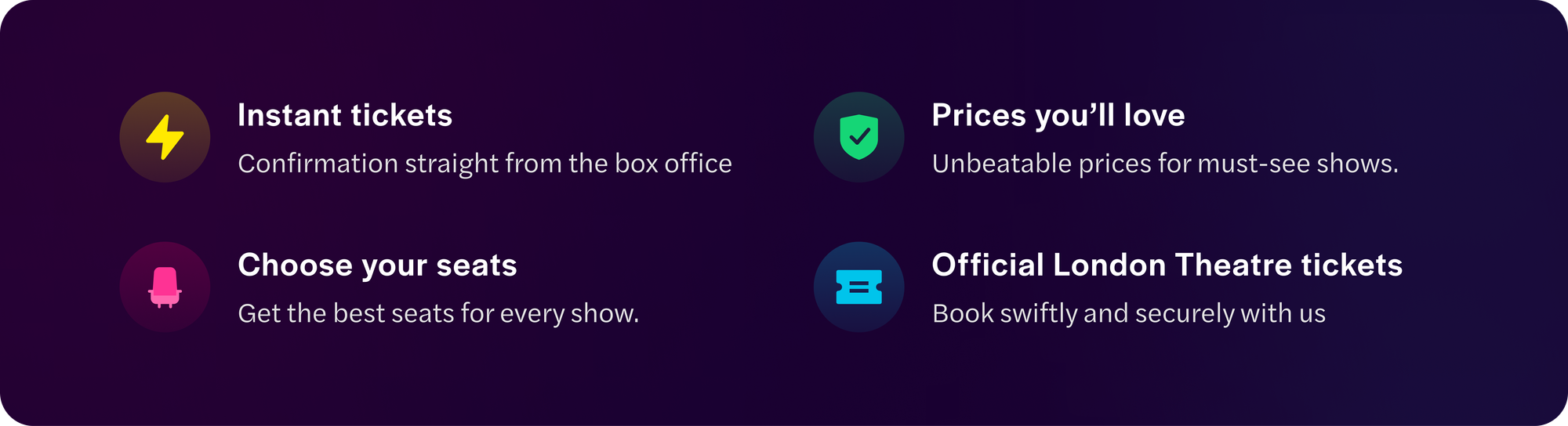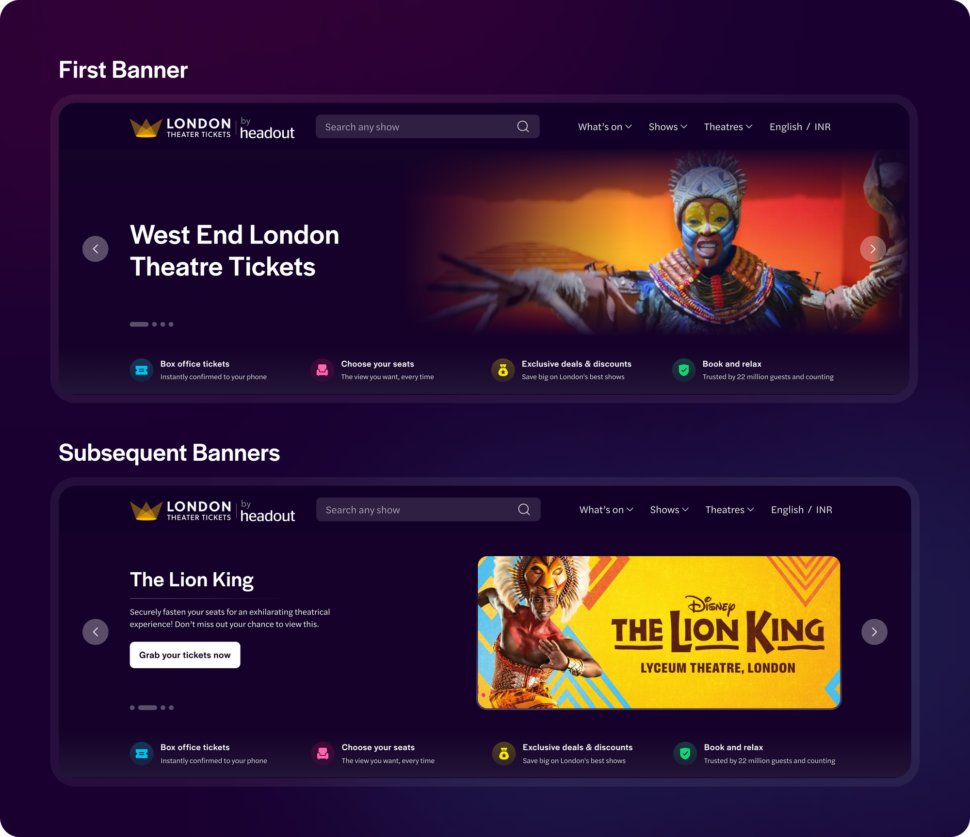 We decided to revamp the banners to not only give the user a feeling of theatrical performances in the West End but also promote the shows and sales that are going on. We did this by introducing: