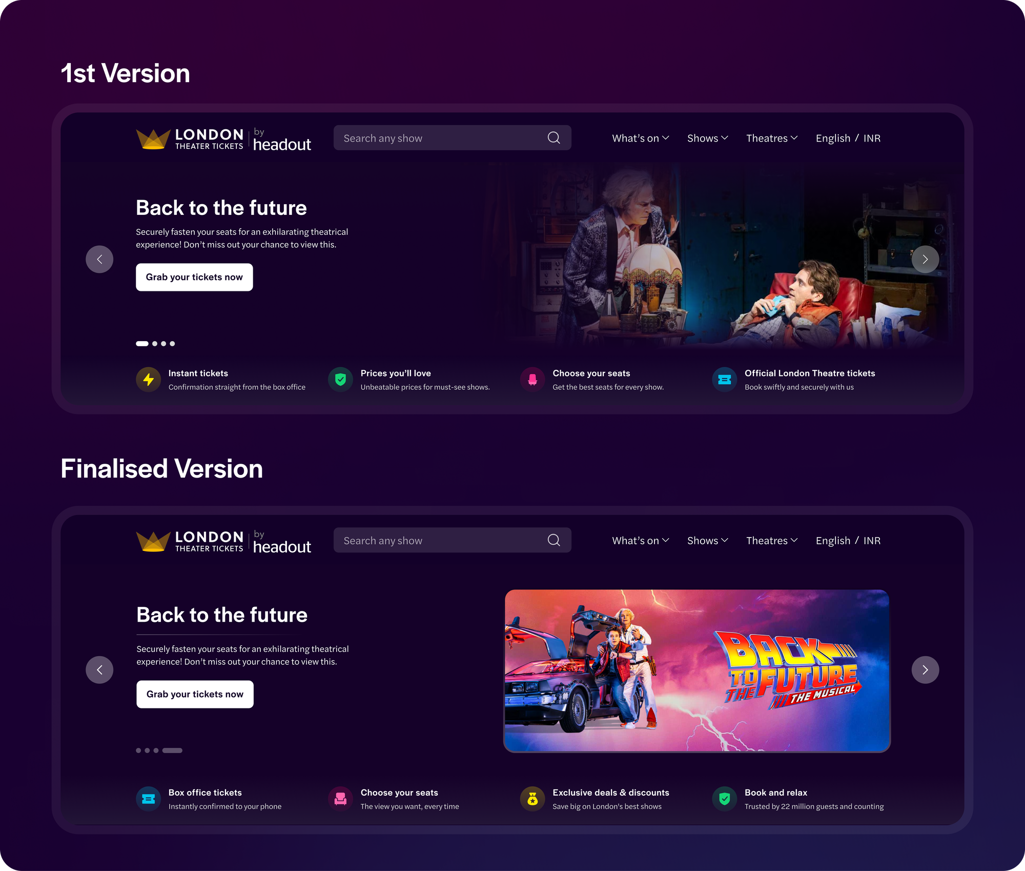 - Initially, we were using a show’s performance images to promote that respective show in the banner. After doing some research, we realised that users resonate with show posters more than the performance images since that’s what is mostly being advertised and presented to them in the pre-booking cycle. Hence, in the latest designs we replaced all the performance images with the respective posters.
