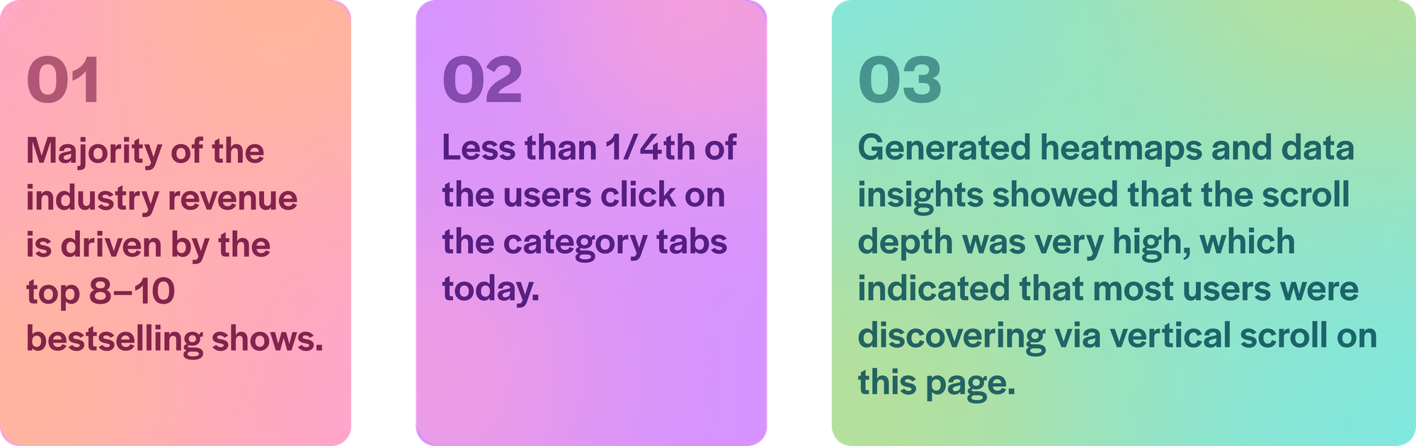 To help users make a decision on which show to watch, we introduced category carousels on the page. Here we populate the bestselling shows of each category stacked next to each other. The purpose of these sections was to further aid discovery and help users conclude what show they’d like to purchase. Hence these were positioned below the “Top shows” section of the page.