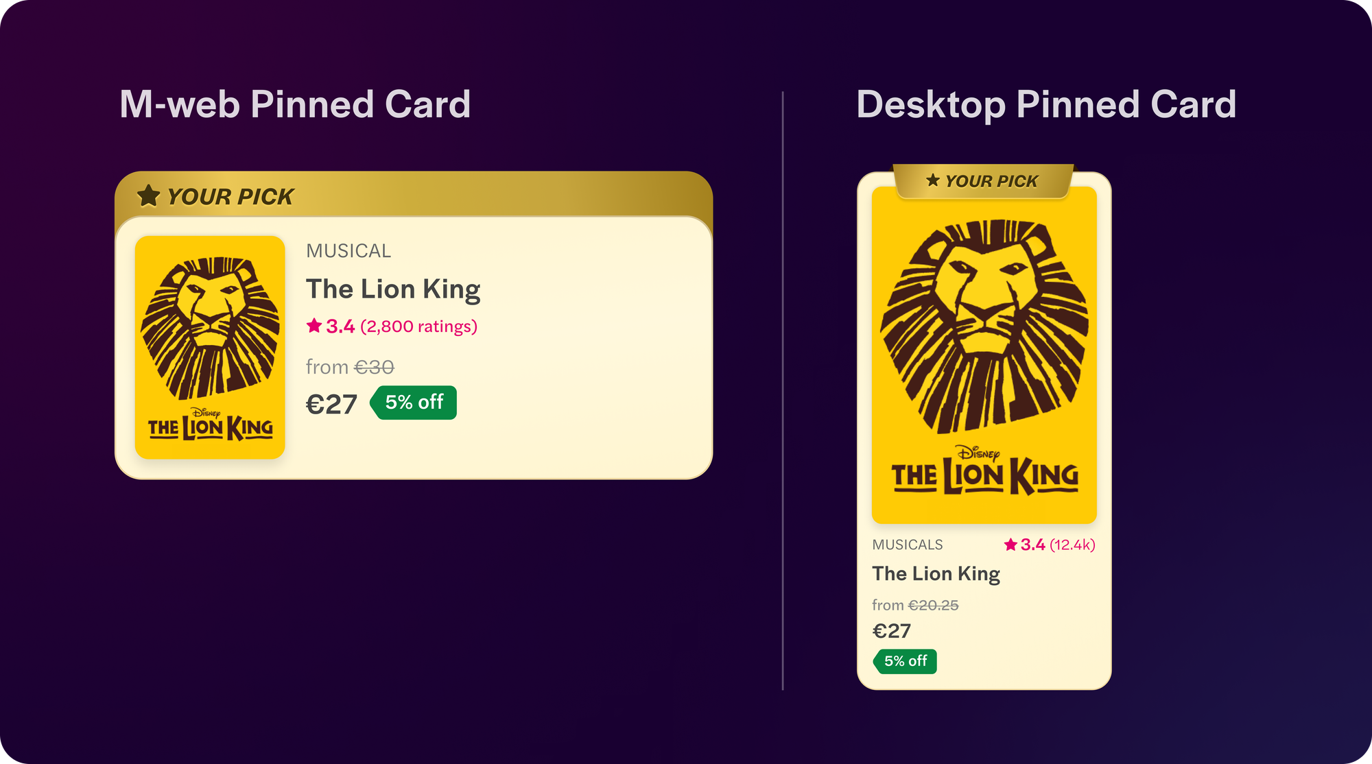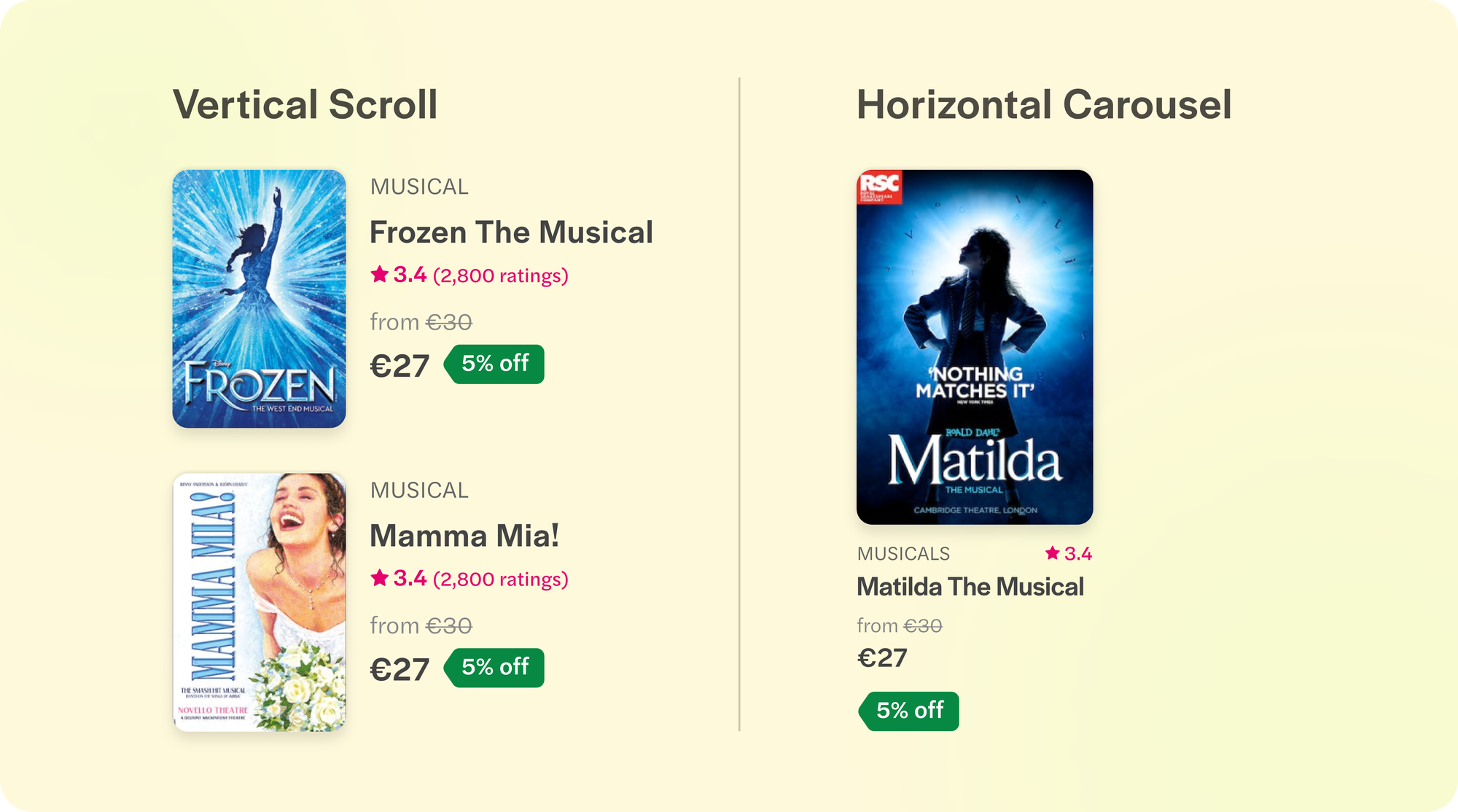 On M-web, there are 2 different kinds of product cards: One style is used for the top West End shows section where we sort product cards by popularity. This is a vertical scroll down the page. The second style of product cards are used in sections below, which are horizontal carousels and made to cater to specific categories like Opera, Musicals, etc. or to cater to specific user needs like Last minute tickets.